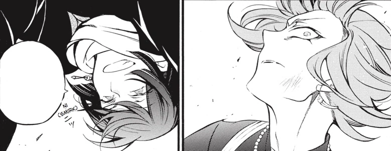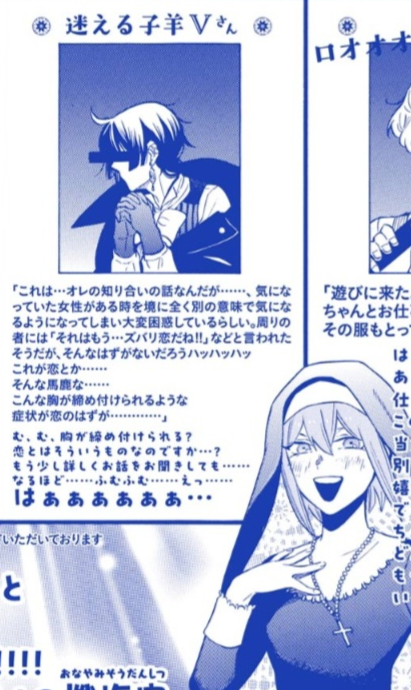 Altosfo opens the confessional, dressed as the Sisters, and he listens to Vanitas's concerns about his relationship with Jeanne, who seems to be more open to Astolfo than Olivier's version. Vanitas is deeply distrustful of him.