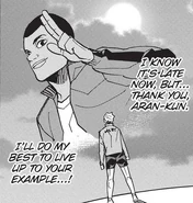 During the timeskip long after both have graduated, both Atsumu ad Aran decide to go pro, Atsumu playing for the MSBY Black Jackals and Aran playing for the Tachibana Red Falcons. after making a joke that fails with the MSBY team, Atsumu pictures Aran in the clouds and comments how he took him for granted and promises to live up to his example. In the very next few panels Aran also makes a joke that falls flat and seemingly has a wistful expression.