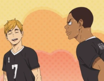 Atsumu and Aran are both members of the Inarizaki High School volleyball team, Aran is a year ahead of Atsumu making him a third year and Atsumu a second year. Aran is Inarizaki's ace and is known as one of the top five aces in Japan, Atsumu is the starting setter for Inarizaki and holds the title of Japan's best high school setter. The two can occasionally be seen teasing each other, but never in a serious manner. Their interactions often resemble a boke and tsukkomi / straight man and wise guy duo.