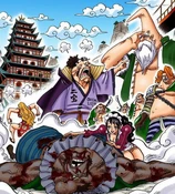 Baby 5 initially fought Sai in Dressrosa because he was on opposite sides. During her struggle with him, she had a misunderstanding in which she interpreted his words as a series of romantic jokes. In his opposition to her tendency to do everything that is asked of her, he told her to kill herself. She almost did, but he quickly stopped her despite Don Chinjao having told him to let her do the deed. He had tried to prevent Sai from saving Baby 5, but after Sai had unlocked the haki during Don Chinjao's attack, he uses it and puts Don Chinjao out of commission.
