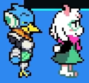 Later, the Kris and Susie find Berdly near their chambers, reuniting with Ralsei after finding out that he got a position as Queen's butler. Berdly feels sorry for siding with Queen, her betrayal of him causes him to try and help the heroes rescue Noelle and seal the fountain. He gets the idea of teaming up with Susie to sneak into Noelle's chamber, calling Ralsei "Kris' lackey" when telling him and Kris that they should try to distract Queen on their way. As Berdly leaves with Susie, Ralsei asks Kris if they also think of him as their lackey, regardless of what Kris says, Ralsei will take it as a compliment.