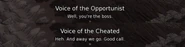 Cheated and Opportunist's personality as well as Personality Power greatly differentiates the other. Explained prior, Cheated is feisty and bad-mouthed due to the events correlating with his title. Opportunist is collected, for the most part, and can be smug to coward. The disparity initiates the Opposites Attract trope. Though they are considered fellow voices, they don't tend to share the same goal depending on the context.