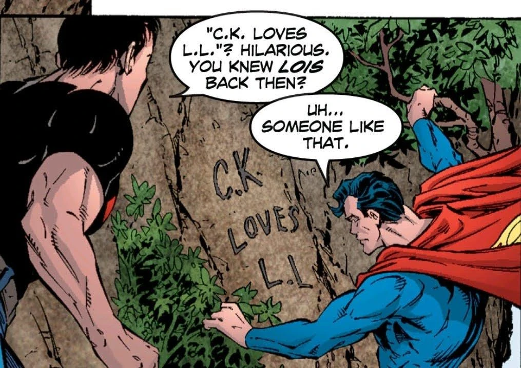 Adventure Comics Vol. 2 #6 (released in 2010), written by Geoff Johns and illustrated by Francis Manapul. In this issue, Conner Kent (Superboy) is visiting Smallville with Clark Kent. While exploring, Conner finds a tree with the initials "CK loves LL" carved into the bark within a heart. Because Superman is famously married to Lois Lane, Conner assumes the carving refers to her and asks, "You knew Lois back then?". Superman’s awkward and evasive response—"Uh... somebody like that", was supposed to allude to Lana Lang, of course, but most fans humorously choose to interpret it as an Clex moment... because after all, Clark Kent also knew Lex Luthor back then.