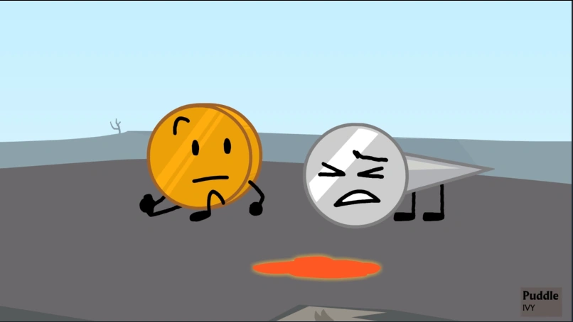 Coiny and Naily wake up on the surface to find that all of the lava was drained from the area. He wonders how the lava didn't kill them. Naily coughs out some lava and thinks the lava wasn't strong enough to burn them as it couldn't burn the inside of her mouth or lungs, as they are metal. The two meet up with Flower, who's running. Coiny asks why is she running so fast. Coiny says it isn't a challenge to reach X, but Flower confirms that it is. They realize a challenge is playing out at that moment. Coiny then turns back and kicks Naily hard enough to make her fly back before running off. Naily ends up getting up quick and attempt to catch up. Coiny ends up being picked up by Needle and Naily is stabbed into the ground, putting her team up for elimination.