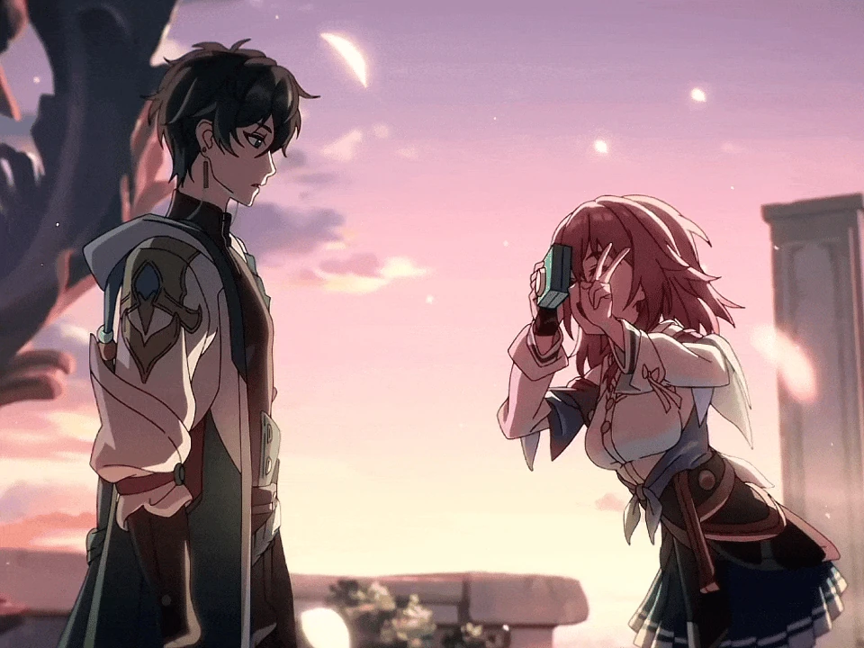 - There is an animated video by Hoyoverse focused on Dan Heng, where at the end, March takes him out of a negative headspace by asking him to smile for a photo. He then indulges her, holding up a peace sign as she takes the photo of him with a bright smile on her face.