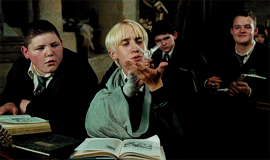 Draco revists Harry alongside Crabbe and Goyle on the train and unhesitantly insults Ron off of his poorness in his family. Before a clash can ensue, Draco notices Professor Lupin, the new Magic Against the Dark Arts instructor, and retreats due to the fear of being caught by one of the Hogwart’s staff. When one of the many Azkaban guards horrifies Harry to the point of him fainting, Draco does not fail to hear about this, and confronts Harry on the matter. During the feast to celebrate a new school year, Harry and Ron glance over the Slytherin table and notice Draco mimicking Harry’s fit to his many peers, earning a laugh from most.