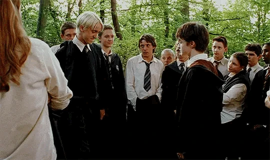 When Harry arrives at Hogwarts, they meet again. Rumor has it that Harry Potter is on the train, and Draco goes to introduce himself. He holds o his hand and offers to be friends. Harry coldly refuses, causing Draco's cheeks to flush. This almost leads to a fight between the boys, but they back off after Goyle is bitten by Scabbers. From that moment on, the boys were rivals at Hogwarts. Draco was jealous that Harry Potter was a hero and believed strongly in blood purity, insulting many in Gryffindor.