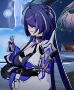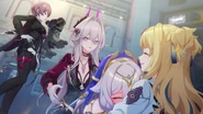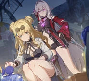 In Azure Waters, Seele witnessed Sin break Bronya's legs, unable to do anything. Days later, after Seele had found out about the stigma consciousness in her body, Veliona goads her into getting revenge against Sin. Seele nervously confronts Sin over what she did to Bronya, but Sin easily overpowers her. Veliona couldn't watch any longer and took control of the body. She entangles Sin with her dark energy and plucks one of Sin's teeth out. Veliona then decides to get revenge for Bronya by taking Sin into a mind realm, where she pushes Sin off the stairs the same way Sin did to Bronya. She watches amusedly in the real world as Sin quickly succumbs to the mind torture. Veliona's excitement is cut short when she finds a paper Sin was holding, which revealed that Bronya was one of the test subjects for the dangerous X-10 experiment.
