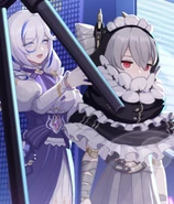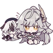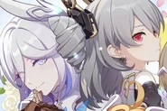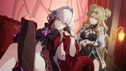 Sin and Dark Seele, otherwise known as Veliona, were both members of Cocolia's orphanage. Since Veliona was a stigma living in Seele's body, Sin wasn't aware of her existence. Veliona holds a strong contempt for Sin due to how she mistreated Seele and Bronya. After the events of Azure Waters, once Veliona stopped being dormant in Seele's body, she often took the opportunity to get back at Sin such as by switching out the ketchup bottle with spicy chili sauce[7] and attempting to throw the remote at Sin's head.[8]