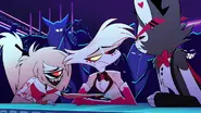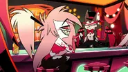 When the hotel became full of sinners and Husk was struggling to serve all of them drinks in "New Pentious," he asks Cherri for help. Pointing that she has come to stay at the hotel, but Cherri says that she hadn't checked in and is simply hanging out at the hotel. Stating that there is a difference and refuses to help Husk, as she doesn't believe in Charlie's goal like Husk has.