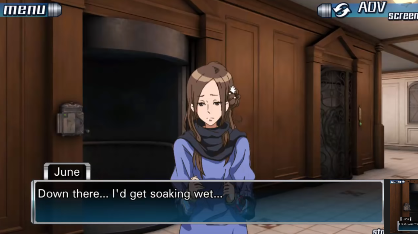 No matter which door Junpei goes through, they all eventually lead back to the hospital room. The players then choose to go off in separate directions to further explore the ship, with Akane and Junpei sticking together. They discover an elevator, and share an innuendo-filled conversation about taking the elevator down to the lower decks. While Junpei thinks that they're discussing being close, and potentially making love, in the elevator, Akane is talking about potentially drowning in the water on the lower decks.