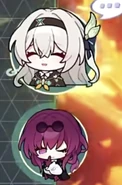 Before both Kafka and Blade participated in the script to lead the Astral Express to the Xianzhou Luofu, Firefly and Kafka took part in the Jepella Rebellion script together with Blade and Silver Wolf. Firefly along with Blade drove through Jepella to meet with Kafka who was currently orchestrating the beginning of the Jepella Rebellion by using her spirit whisper on the Jepella Brotherhood. When they arrived Firefly then transformed into Sam and rescued Kafka from Jepella Palace, commenting that she really should change her habit of playing with her pray, to which Kafka stated that she knew, but would do it next time as it was already too late now.
