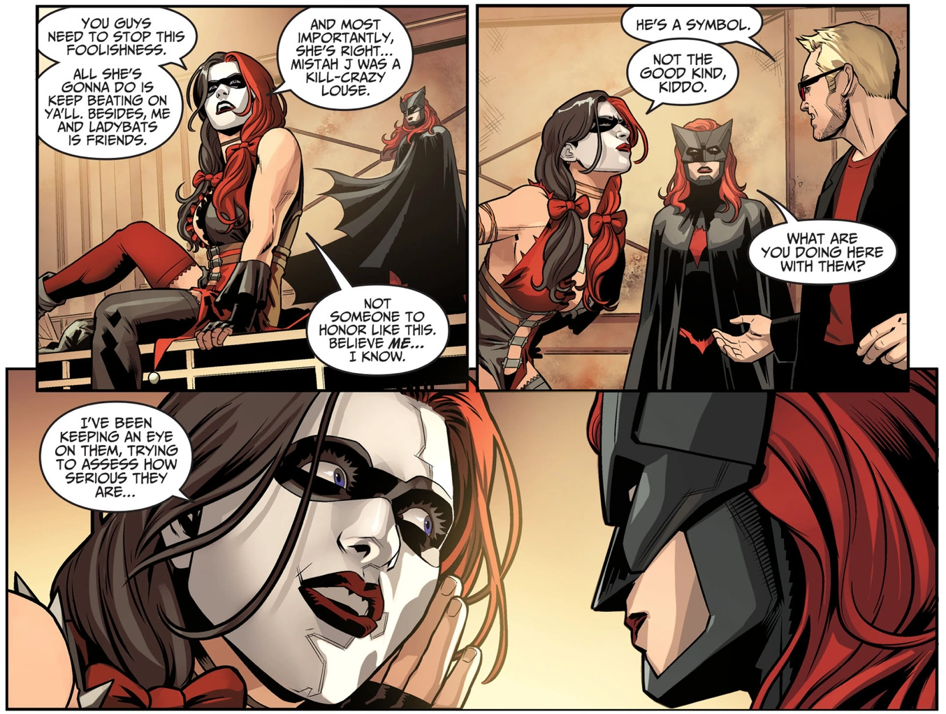Harley decides that will take too long and gets onto the stage at the front. She tells them that they need to stop, or Kate will keep beating on them, and lets them know she and Kate are friends. She says that Joker was not someone to honor, and she would know. Kate asks what Harley was doing there, and Harley whispers to her that she's been keeping an eye on how serious the group is. Their leader says he's serious, and Kate says that if they are, they'll avoid invoking the Joker. With Harley telling them that they need to play a new card. She says that if they agree to disarm themselves she'll help, and will be back when they do, following Kate as she leaves.