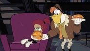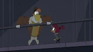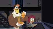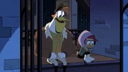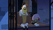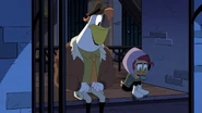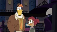After watching Gosalyn and Drake argue, Launchpad follows Gosalyn to her spot at the window. She admits that she knows she's being hard on him, but she needs to find her grandpa. Launchpad understands, and also reveals that Drake hasn't slept in days for that reason. Gosalyn is confused, and Launchpad tells her that Drake has been spending his free time talking to Fenton about a way to get her grandpa back. Gosalyn is surprised and then goes over to listen to Drake talking to Fenton.