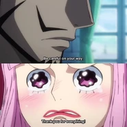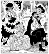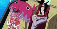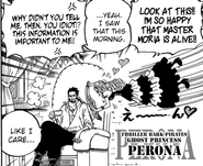 However, she would express great irritation with Mihawk after she later found out her captain, Gecko Moria, was actually alive and he had not informed her of this. She berated him, but Mihawk remained indifferent and stoic, simply ignoring her complaints. In a tantrum, Perona grabbed her things and sternly informed Mihawk that she is leaving. Before she can do so, Mihawk tells her to "be careful" on her travels which causes her to turn around and cry at what are very likely the first kind words he has ever said to her.