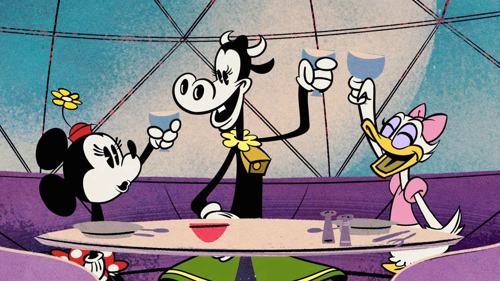 Minnie, Daisy, and Clarabelle fall into the now vacant restaurant. The three girls excitedly clink glasses in celebration.