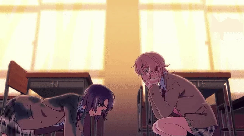 Eventually, Muu finds Rei on the floor after being bullied and looks at her curiously while blushing, an interaction that ends with Rei turning the tables on her and fighting back by slamming a chair into Muu's face in front of their classmates (also represented as the hourglass being turned over). Seeing how easily she crumbled from the event, Muu's classmates and lackies turned against her and start subjecting her to the same bullying that Rei experienced. After Rei found Muu on the bathroom floor and offered nothing but a blank stare before quickly turning away, Muu couldn't take it anymore, which culminated in the murder of Rei as seen in both "After Pain" and "It's Not My Fault".
