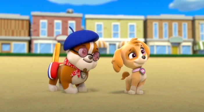 In “Pups Save the Turbots”, Skye becomes infatuated with newcomer Francois Turbot due to his French accent. Rubble, apparently somewhat jealous, dons stereotypical French attire and tries to affect the accent himself. Skye doesn’t seem to notice his attempts, however, and responds distractedly as she continues to observe Francois.PAW Patrol: The Movie[]