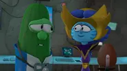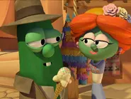 Larry plays the adventurous archaeologist Minnesota Cuke, a parody of Indiana Jones. Petunia Rhubarb plays Julia, a former archaeologist, ice cream shop owner, and researcher who helps Minnesota on his quest to find Samson’s legendary hairbrush, which is said to give great strength. Throughout the story, Julia and Minnesota work closely together. Julia is smart, confident, and practical — often guiding Minnesota when he gets nervous or distracted. Larry’s character clearly admires her, and their interactions have light, funny hints of affection, though nothing overtly romantic. By the end, Julia helps Minnesota learn the true lesson: that real strength comes from God, not from objects or revenge. She respects him for his courage and faith, and he’s clearly impressed by her wisdom and kindness.