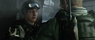 Back in the city, Alpha Team comes to see a woman flashing a National Security badge with a man at her side. Piers takes notice of the man she’s with, as he’s a “wanted insurgent”. The woman, Sherry Birkin, tries to defuse the rising tension by saying that Jake Muller, the man she’s with, is under the protection of the U.S. government and that he’s not a threat to the B.S.A.A. Following a few more heated words, everyone is attacked by the Ogroman they lost earlier. After its defeat, Jake insults Chris after Chris asks him a question, causing Piers to lunge forward as if to confront Jake personally. Chris manages to hold him back by throwing his arm across Piers’ midsection as Jake and Sherry board a waiting helicopter. Piers throws Chris’ arm down in frustration, but does not engage, though he does turn back around questioning why they don’t arrest him. Chris is calm in telling him that “he’s not our problem,” and that “we can’t lose sight of the B.S.A.A’s mission”. Finn comes up from behind Piers, telling him, “To fight bioterrorism, sir.” Piers snaps back, “I know what we’re here for, rookie.”