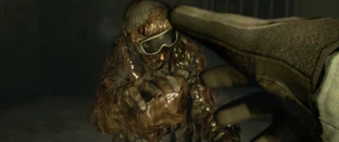With the woman in tow, they head back to their comrades who are currently engaged in a heated fight with the first encountered hatched Napads. Following the guidance of the woman, believing her to be City Hall staff, she leads the team into a cell with built-in lock gates, separating Chris and Piers from Finn and the rest of the team. From the other side, the woman tosses a needle bomb with the C-Virus into the area with Finn and the others. Chris and Piers are left helpless as they watch their teammates turn into Napads. As Finn melts and bursts into flames, he desperately reaches for Chris’ hand coming through the bars of the gate, succumbing to the virus moments later. Chris is devastated and too distracted when he sees Finn turn that when the gates do open the mutated Finn beats Chris, throwing him hard against the wall and ground. Piers does everything in his power to protect Chris, immediately opening fire on Finn. Miraculously, Piers is able to grip Chris by the collar of his uniform with one hand and pull Chris back, all while firing his rifle in the other, presumably killing Finn himself.