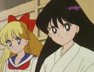 After Makoto and Ami's Sailor Crystals were stolen, Rei tells Minako that she'll come with her to Juban High School to investigate Three Lights. Minako lends Rei her school uniform which she notes fits Rei perfectly. According to Minako's info book on Three Lights, they should be going to the rooftop during lunch that day, so Rei and Minako go there to find them. While they're waiting, Rei says she wish she chose to go to Juban High so that she could have spent the rest of her high school days with her friends. Minako asks why she thinks that all of a sudden, so Rei shows her that she drew the "Death" Tarot card that morning. Rei says she feels that the current battle is different. She's about to say that they really won't come home this time, when Minako puts her finger to Rei's lips. She tells her that this time it's no different; they'll complete their mission and return home alive.