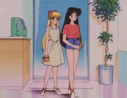 Minako uses her Crescent Compact to acquire a T·A Girl's Academy Uniform. Even though Rei warns her not to be too rambunctious, she gets into trouble and Rei has to apologize for her multiple times. During a volleyball game, Minako runs off to find the ball which had gotten lost in the bushes. She finds an old well, and opening it gets her all dusty and dirty. She takes the ball back to the main school grounds, and overhears Rei talking with her classmates. Minako thinks that Rei is like a total stranger.