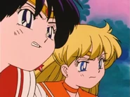 Rei sees Minako and laughs a bit that she's all grimy. Minako gets upset that she laughed at her and says she's a vulgar commoner, unlike Rei. Minako tells Rei she hates her and runs away, but notes that she looked just a little sad for an instant. Rei chases after Minako, but then the ghost that Minako uncovered when she opened the well enters her body. Minako reflects that perhaps she overreacted, and is startled when she hears a scream. She sees Rei trying to kiss another student. Sensing a demonic aura, Minako transforms and knocks Rei in the head with her Crescent Boomerang. She makes the ghost come out and introduce itself, but it reenters Rei's body, and Rei then tries to kiss Minako. Minako uses an ofuda and cries out "Evil Spirit Begone", destroying the ghost and rendering Rei unconscious.
