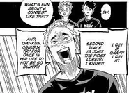 Later on, Atsumu and Hinata tried showing off to the crowd in an attempt to replicate Bokuto's grand entrance with cartwheels and backflips, but Sakusa promptly stops the two. Sakusa also reacts by saying "Ew." after Atsumu goes off when Hinata mentions how Kageyama beat him in the setter ranks. The players on the EJP Raijin team discuss Sakusa prickly personality. Atsumu's old teammate, Rintarō Suna, says that Atsumu is a jerk so he deserves to be on the same team as Sakusa. Atsumu is described as a big fat jerk while Sakusa is described as a too-blunt jerk.