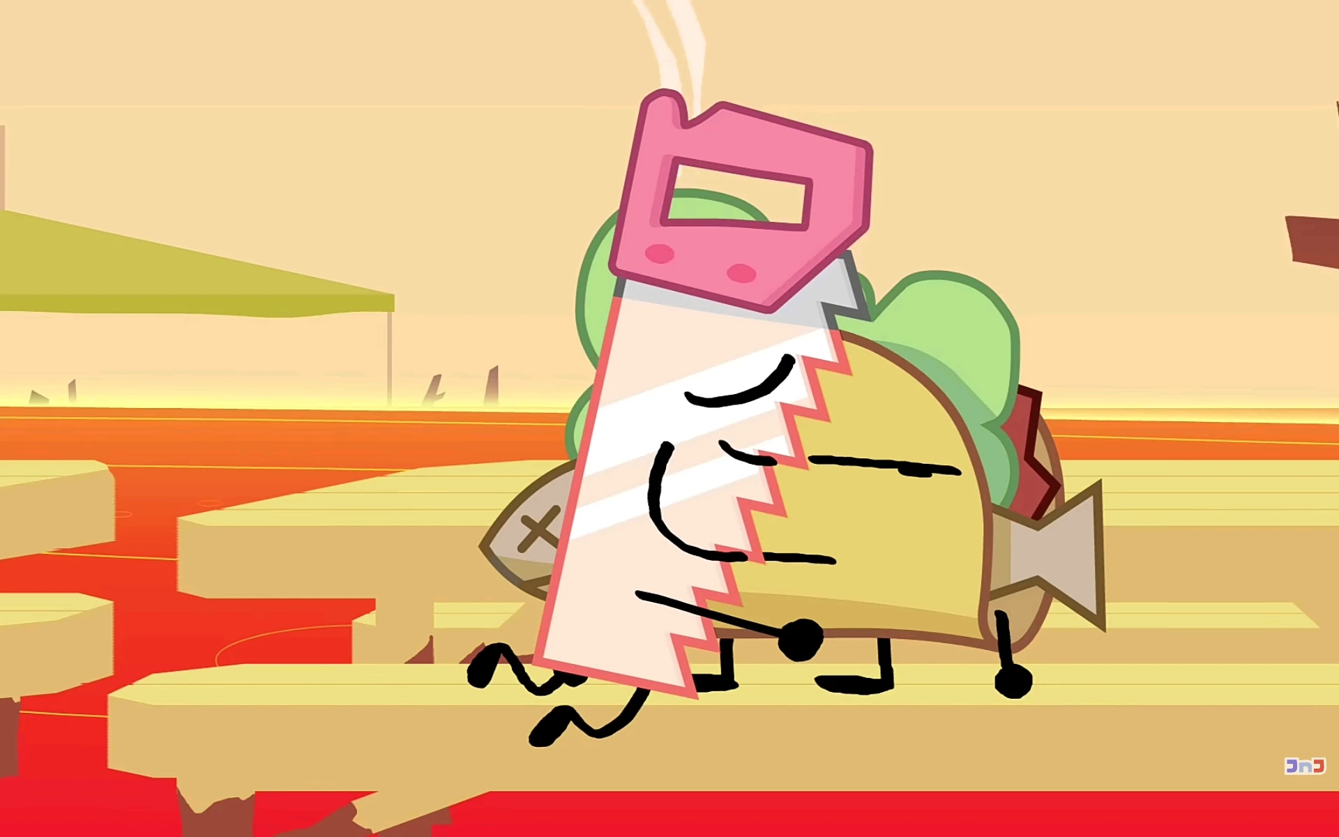 While chasing X's basket in the desert, Saw asks if they really have to run through the desert, to which Taco responds, "That's where the basket's taking us!". They have two more similar interactions while running through the World's Largest Oven and while swimming through lava.