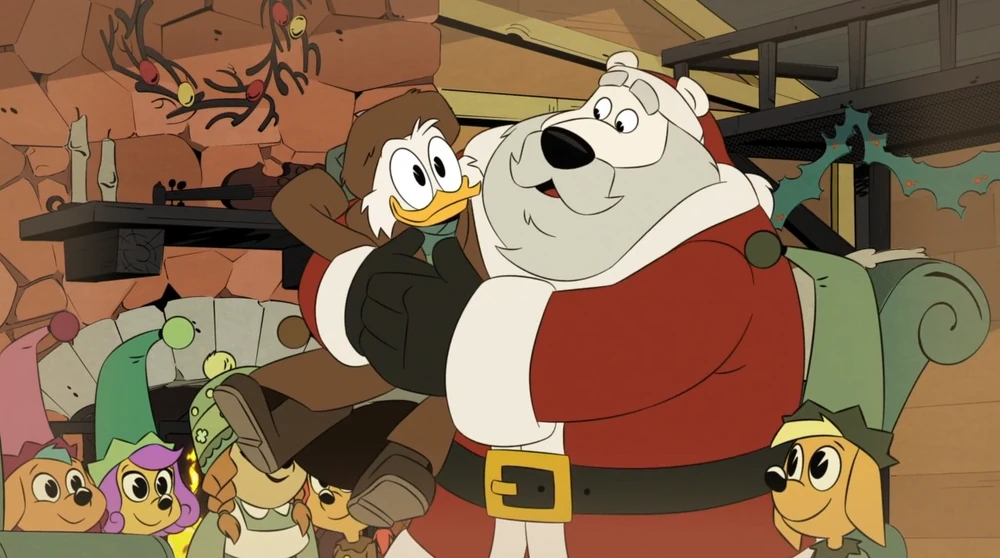 In "Last Christmas!" Scrooge is again shown to dislike Christmas. This is likely a reference to the 1983 classic short "Mickey's Christmas Carol", in which Scrooge plays the role of Ebenezer Scrooge (his namesake). When he spots a decoration of Santa Claus, he demands to know which of his relatives put it up. They all deny it, and watch on with shock as Scrooge uses his cane to beat the decoration. While doing so, he calls it a "traitor". Later in the episode, it is revealed that Scrooge doesn't actually hate Christmas. However, when asked about his feelings on Santa Claus he says "that churlish chimney chaser is not to be trusted".