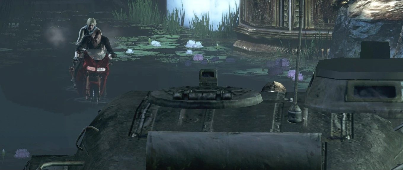 Jake and Sherry make their way for the communications room where Sherry is able to contact with her superiors, surprised to learn that they’re already in China. Just as they’re about to exit through the front doors, a tank comes plowing in with more J’avo in coming. As they run away, the tank breaks through the outer wall of the facility. Jake is able to manipulate the tank operator into moving a large statue for him to jump a cross for a motorcycle where he and Sherry make another daring escape.