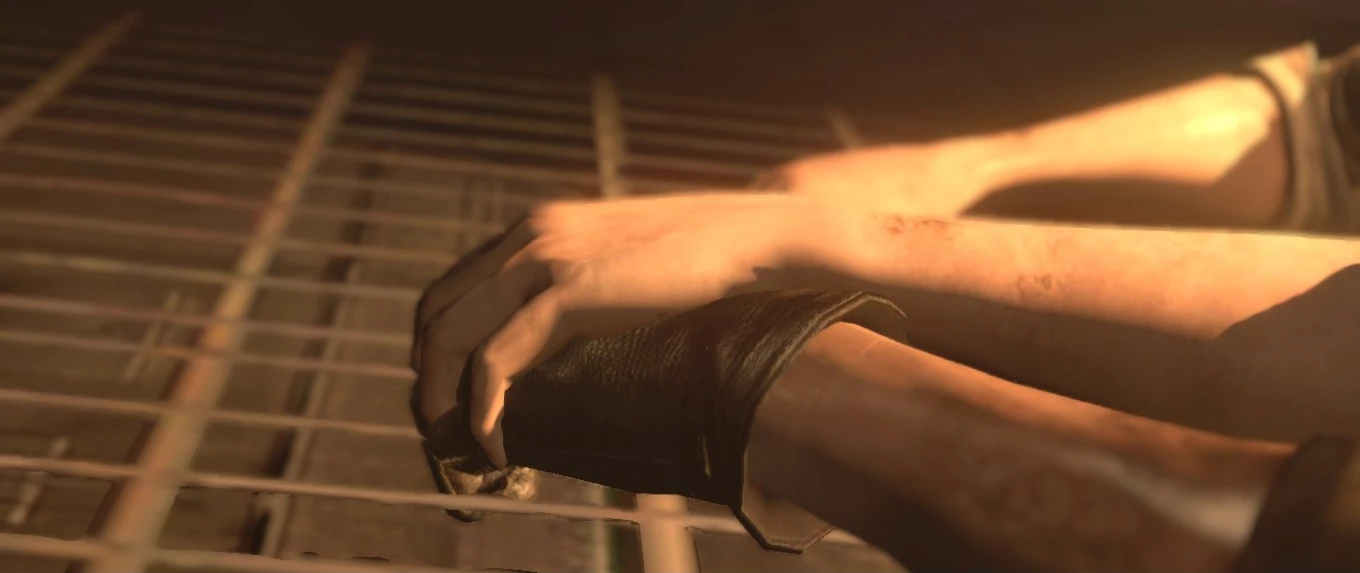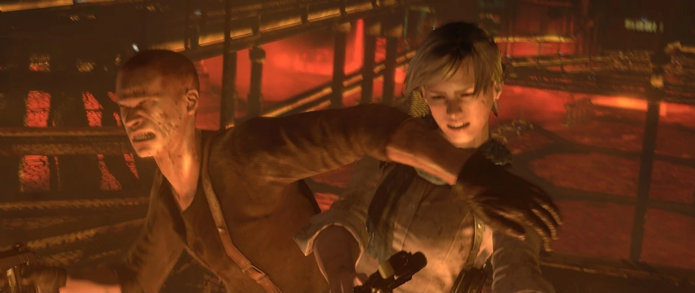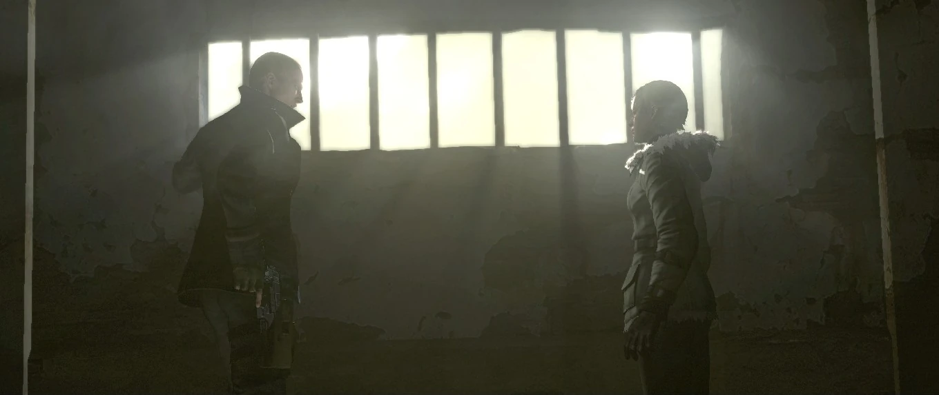 They find a relativity safe spot to break at where Jake tells her his deals for hire. Sherry informs him that she’s not there to hire him, but rather needs his blood to create vaccines for the C-Virus. After a long pause, Jake changes his offer to 50 million dollars for one pint of his blood, non-negotiable. Leaving the building, they notice J’avo outside, realizing they’ll have to “shoot” their away out of the country. Not long after they’re confronted by the Ustanak, a large B.O.W used in primarily for finding Jake. They manage to run from it, only to be found again inside a worn-down warehouse. Throughout the fight, Sherry tells the Ustanak that it’s “not taking Jake”. With the Ustanak down, Jake and Sherry fall through a weaken part of the floor, landing on a lower level. Sherry makes a comment that “this mission gets harder by the minute, but at least [Jake’s] still safe”. Jake huffs at this, and devolves into a story of how three years prior, while in South America, he was nearly killed by a man with a knife, saying how dying for money was one thing, as it was his choice, though dying for “no good reason” was another. Sherry tells him of the Ustanak and Neo-Umbrella being after him, and follows up with that she won’t “let anything happen to [Jake]”.
