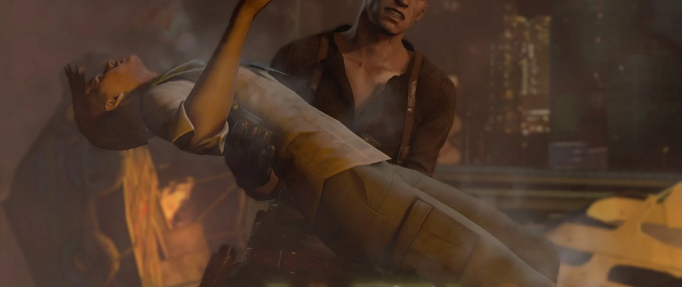 - — Jake catches Sherry after she falls from the attacking helicopter, Resident Evil 6.