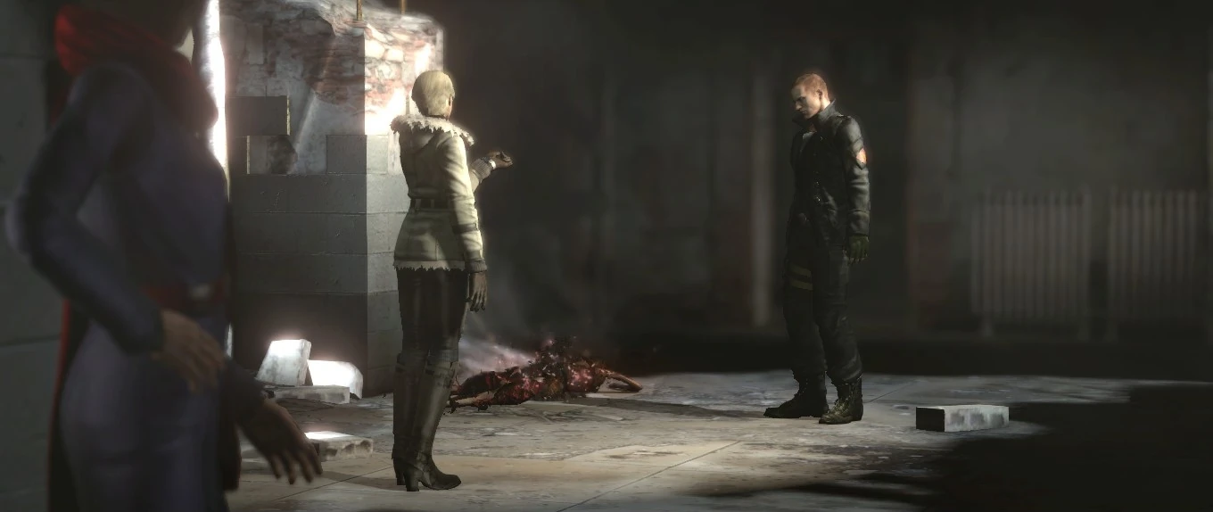 Navigating through the city, Jake and Sherry fight off hoards of J’avo, including the Ubistvo, a chainsaw wielding B.O.W. They watch overhead as an American plane crash lands not too far from their location. Arriving to the downed plane, Sherry immediately recognizes her close friend, Leon Kennedy, along with Leon’s companion, Helena Harper. The two are stunned to see each other and asks what the other is doing there. Sherry informs him that she’s on protective detail, looking out for Jake. Leon and Jake share a look as Leon comments that he had heard she had become an agent. Sherry then asks why he’s there; Leon saying he and Helena are tracking Chief Security Advisor Simmons. Sherry thinks there must be a mistake because Simmons is her supervisor. Leon asks where he is and moves closer to her. Seeing this, Jake harshly shoves Leon away, with Sherry throwing an arm over him to keep things from escalating. Sherry and Jake move away from Leon and Helena where Jake questions her orders about “avoiding contact with anyone”. Sherry is quick to defend Leon, saying, “Leon’s not just anyone. He saved my life back in Raccoon City.” Jake accepts this just as the Ustanak attacks the group. The Ustanak throws a piece of the crashed plane at Sherry, with Jake managing to tackle her down to safety and cover her body with his own. As they stand up, Jake helps her.