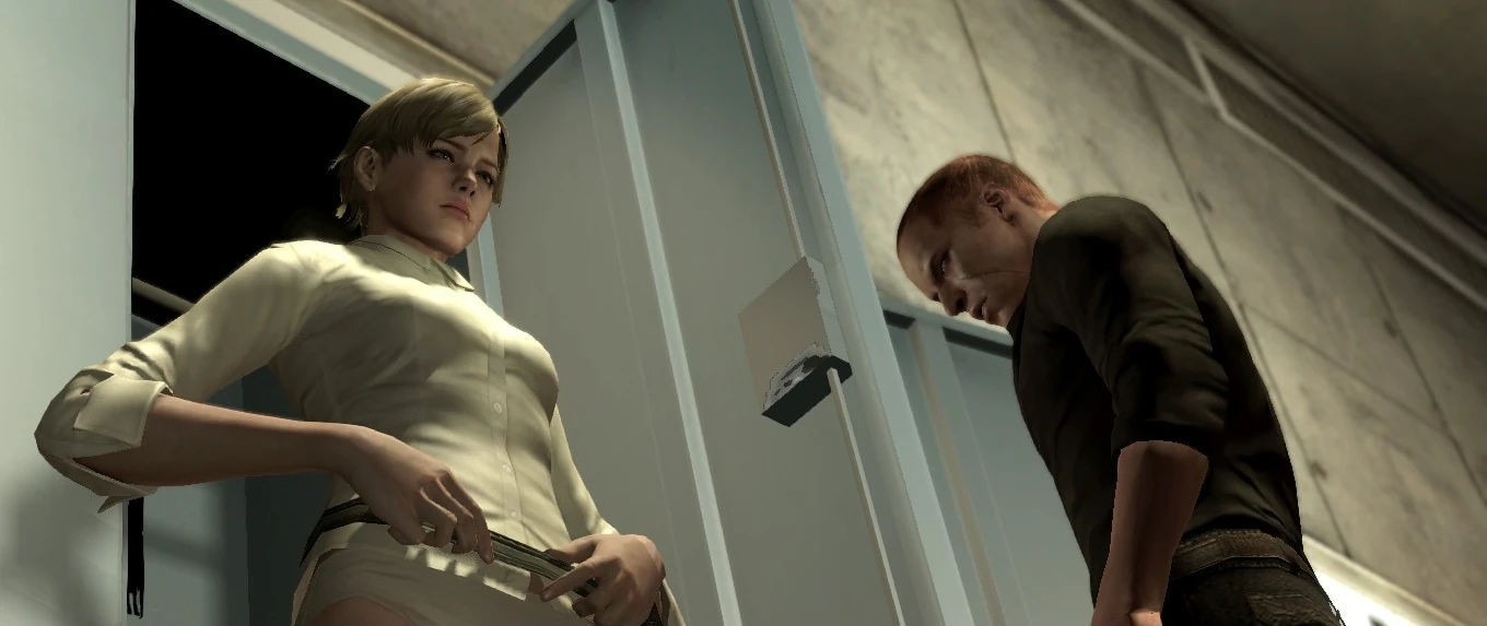 Six months later, in June 2013, Jake finds an opportunity to escape. Once eluding his captors and managing to shut down the facility’s power before making a run for it. Noticing the power-outage, Sherry also seizes the opportunity to escape from her room. The two finally reunite in a locker room where upon seeing Sherry, Jake immediately turns away seeing her in a fairly revealing patient outfit. Sherry quickly covers herself up and hides behind an open locker door. Jake finds clothes in a locker next to hers, where he stares at her bare back has she starts to undress herself. The quite moment is over as Jake is frustrated over his father, Albert Wesker, whom his captors spoke of frequently. Jake feels cheated by life, having been cursed with his father’s blood. Sherry admonishes Jake’s sulking, arguing that how he lives is not up to his father’s legacy, but up to him. To this, Jake has no reply as Sherry coldly hits her shoulder to his as she walks past him.