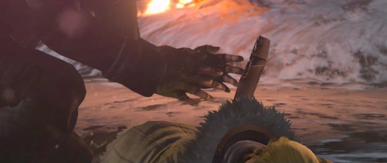 Having successfully located all three data chips, Jake and Sherry find a cabin to wait out the storm in. After a period of time, a near awkward silence has befallen. After Sherry paces the room for a final time, she quickly proclaims that “she’ll go get help” as “it can’t be that much further to the rendezvous”. She makes for the cabin door where she’s met by Jake yelling at her to wait. The snowstorm raging outside slams the door open and Jake struggles to push it closed. Jake and Sherry stare at each other as Jake is still holding onto her by her waist. Sherry leaves for the other side of the room as Jake turns to look outside through the window.