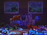 Once CatNap shows up at his house, the critters' faces light up with relief as they all call out CatNap's name. They plead with CatNap, seeking assistance in falling asleep. In response, CatNap releases a red gas from his mouth. DogDay and the others takes on a more unnerving and sinister personality. he and they shows signs of insanity, addiction, and mania when inhaling CatNap's sleeping Poppy Gas, laughing hysterically with the others until they pass out onto the floor. Meanwhile, CatNap is left sitting alone on the couch, beside with Dogday sleeping.