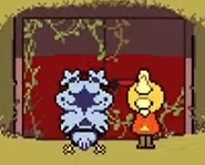 In this timeline, Snowdrake and Monster Kid both live on the surface in Hometown. They are classmates of Kris and Susie. Due to Kris coming late to class, Monster Kid settled on partnering with Snowy on this month's group project. However, they are not thrilled about this, confiding in Kris that they find Snowy to be annoying. When talked to yet again, Monster Kid considers Kris lucky, admitting that they'd rather be partnerless than having to put up with Snowy. However, when Kris talks to Snowy, he admits that he considers Monster Kid to be the "GOOD partner". When Kris asks if they can partner with Snowy, he just tells Kris to scram, since he already has one.
