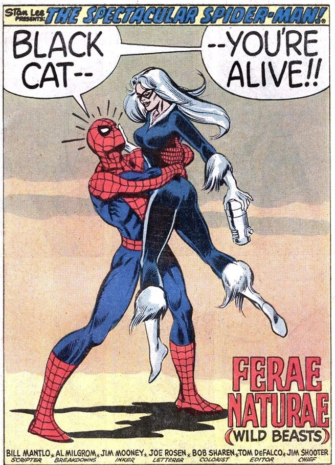 While procuring the necessary weapons and accomplices, the Black Cat came across Spider-Man. Since their first meeting, the latter has been attracted by the cat, and it is more than a recipient. The two flirt as they fight, and Felicia kisses him to distract him (although it is obvious that she enjoys it), only to run away.