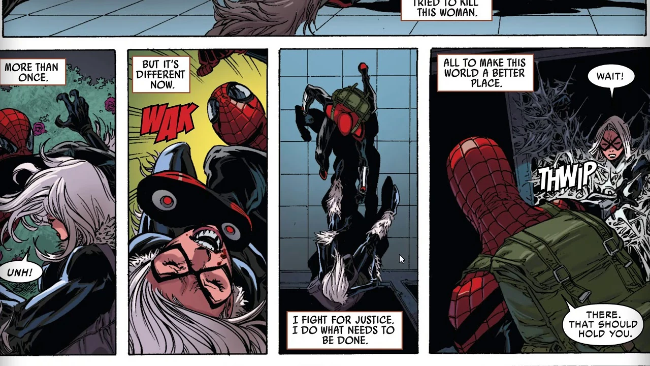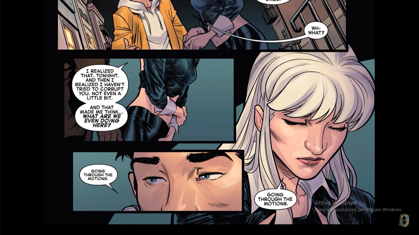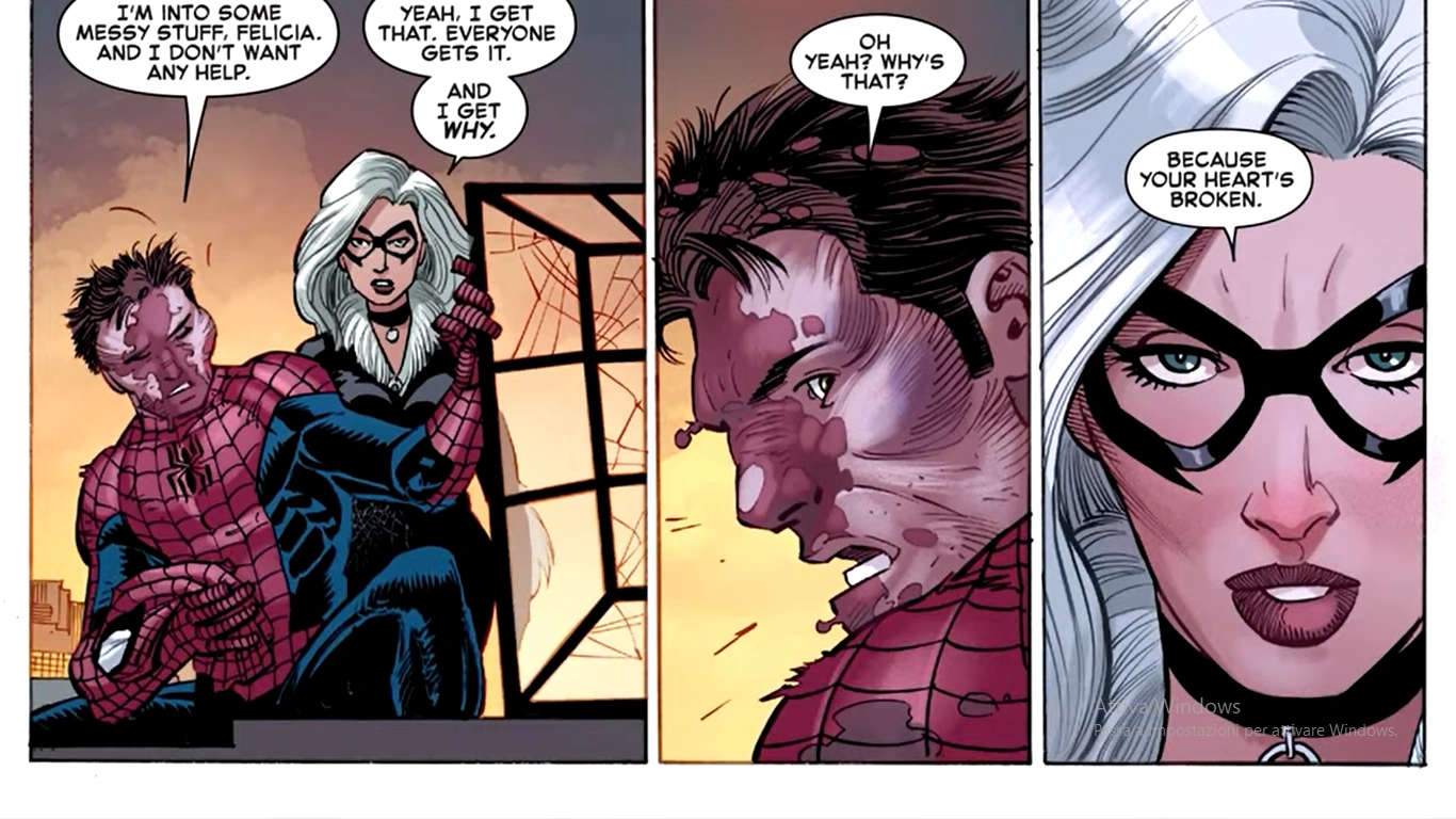 Peter admits to himself that he has behaved like this because he is still in mourning for the Black Cat, and he recognizes that she has been attracting him like no other since the days of Mary Jane and Gwen as far as he knew little, and is certain that she would never have given up to her criminal life. However, Felicia’s thought continues to haunt him.