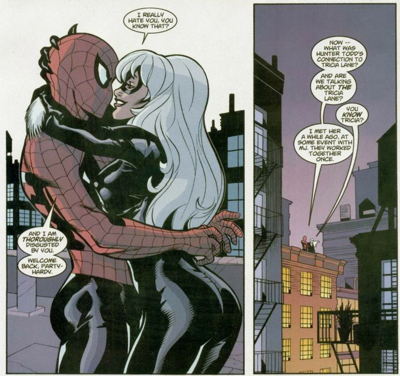 Some time later, while circling over the city, Spider-Man feels called and finds himself in front of the living and healthy Black Cat. The hero is very happy and runs to hug her and kiss her.