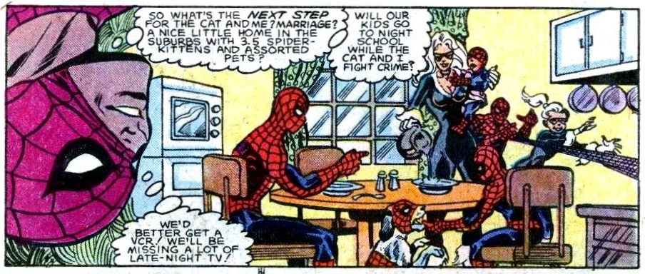 At a certain point MJ gets stuck in another dimension and given the unorthodox methods he uses to get her back, and the fact that he dedicates himself to that alone, Aunt May and many of his friends turn their backs on him. Felicia, however, no. Given the different passage of time between the two dimensions, however, years pass for Mary Jane and so she finds a new boyfriend Paul and adopts two children.