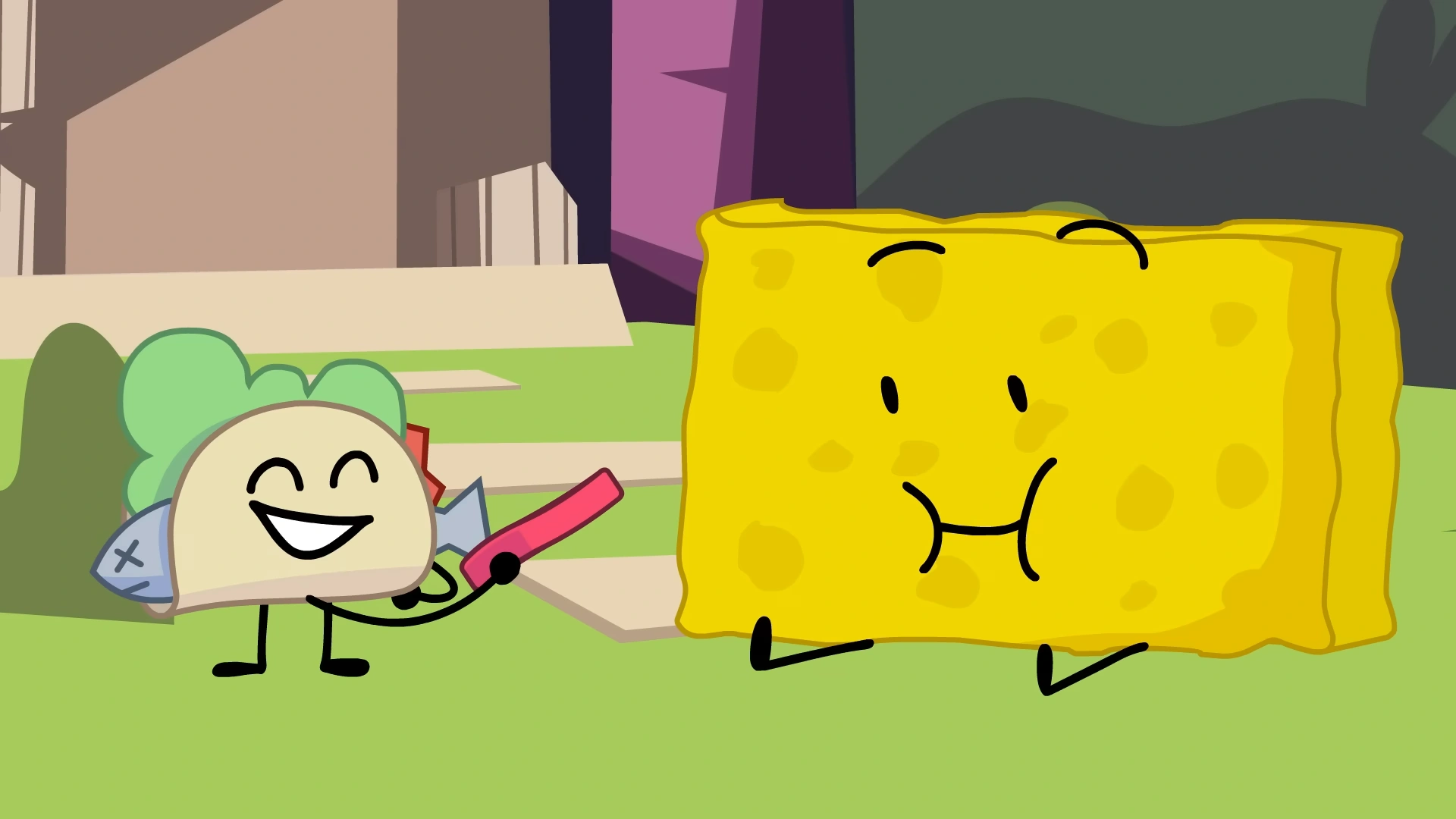 After the first challenge, Taco greets Spongy and asks him about it being nice to be back. Taco offers Spongy a friendship bracelet as a gift for the special occasion. Spongy stretches it around him and puts it on, which he likes wearing. Flower finds the two bonding and becomes jealous since Taco rejected her offer to become allies earlier. In the challenge, Spongy helps Taco with pushing a stack of rocks to throw at their opponent team's tower. Later on, Spongy becomes saddened when Loser cuts his friendship bracelet off of him to use to make a bridge with.