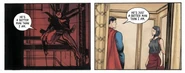 Clark is dying from the Kryptonite when Bruce walks in. He grabs and is about to get it far away from Clark, when the doors close on him. He finds a chemical, but it would take a week to heat through the wall. Clark weakly awakens and tells him to use it on the Kryptonite before passing out again. The Kryptonite melts and Clark forces himself up, but Bruce has to catch him before he falls. Bruce tells him to snap out of it and Clark forces himself up. He grabs both Bruce and Lois and flies them out of the building. They find Joker who throws marble grenades at them, and Clark flies them out again. Bruce brushes Clark aside once they land, and Clark thanks him for helping him save Lois. He couldn't have done it without him. Bruce is aware and takes off on his jet. Lois then realizes that she doesn't know what happened to Bruce, and Clark assures her that he's fine, watching Bruce as he leaves.