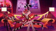 With the show's sister series, Helluva Boss introducing Asmodeus and Fizzarolli to the Hellaverse, it started a theory of Valentino modelling himself after the King of Lust, with people seeing him as the Pride Ring's Overlord of Lust (before Valentino was confirmed to be the Film Overlord), and required Kitty to serve as his Fizzarolli. From how Val's main style bears a similar energy to one of Asmodeus's known forms, while Kitty is modelled from a line of sex robots that were based upon Fizz. Even though Val is shown to mostly use Kitty as a servant rather than a sexual companion, him flicking a cigarette butt at Kitty's head subjects that Val treats them no better than the way he treats Angel Dust. Making Valentino more like Mammon, who has used a pair of Fizz robs as arm candy; just like how the Addict music video and Dirty Healing prequel comic showcased Val with his own arm candy.